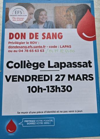 COLLECTE DE SANG ORGANISÉE AU COLLÈGE LAPASSAT